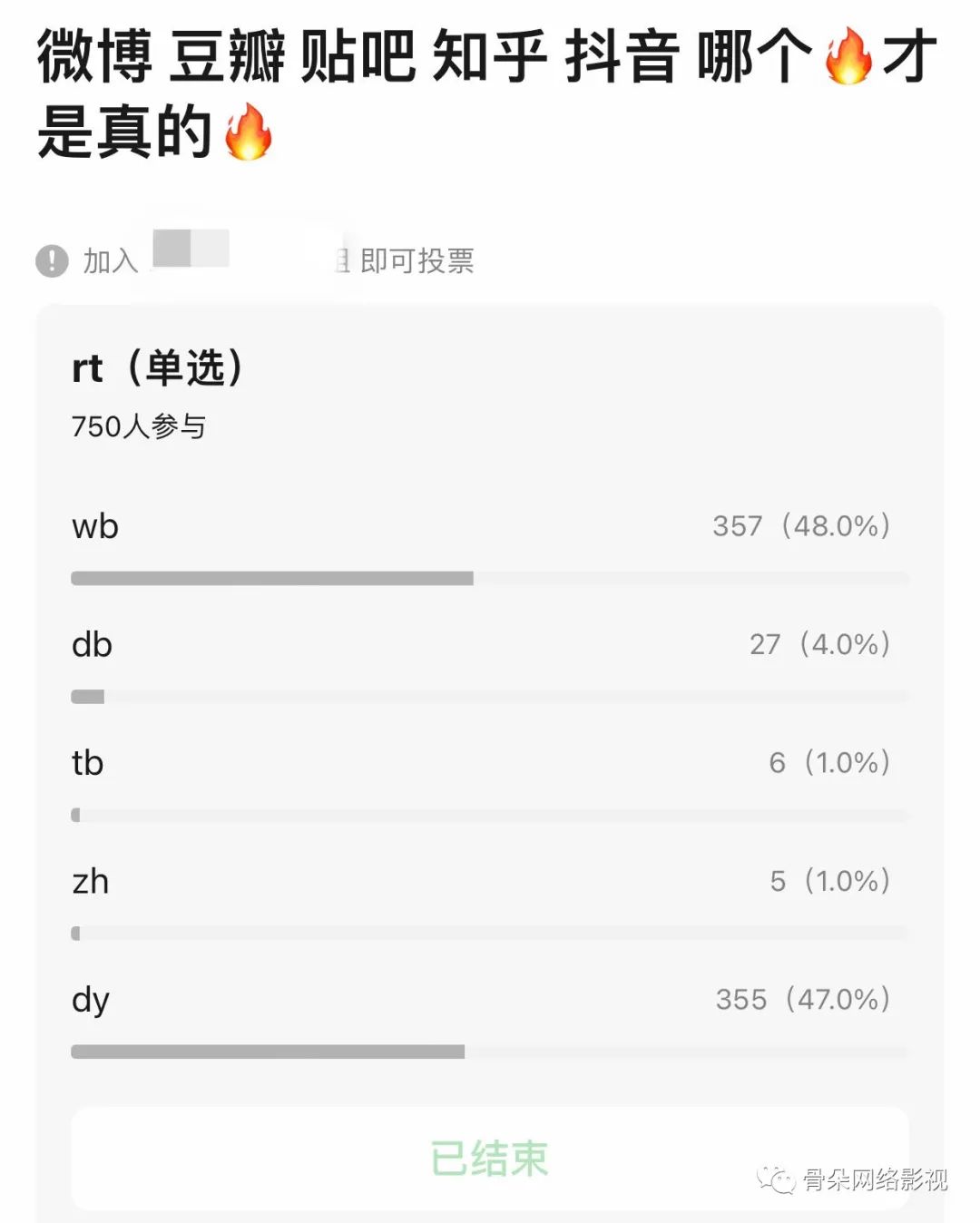 在豆瓣某娱乐小组发起的一个名为“微博 豆瓣 贴吧 知乎 抖音 哪个火才是真的火”的投票中,抖音和微博平分秋色,而参与投票的750人中,仅有27人投给了豆瓣,贴吧和知乎更是只有个位数。