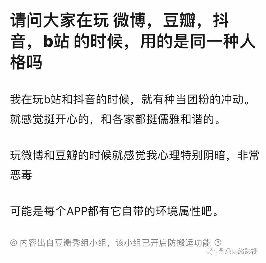 豆瓣虽然小众,却也有其优势,比起喜爱跟风拍相似梗的抖音,豆瓣、微博上聚集的原创内容生产者更多。