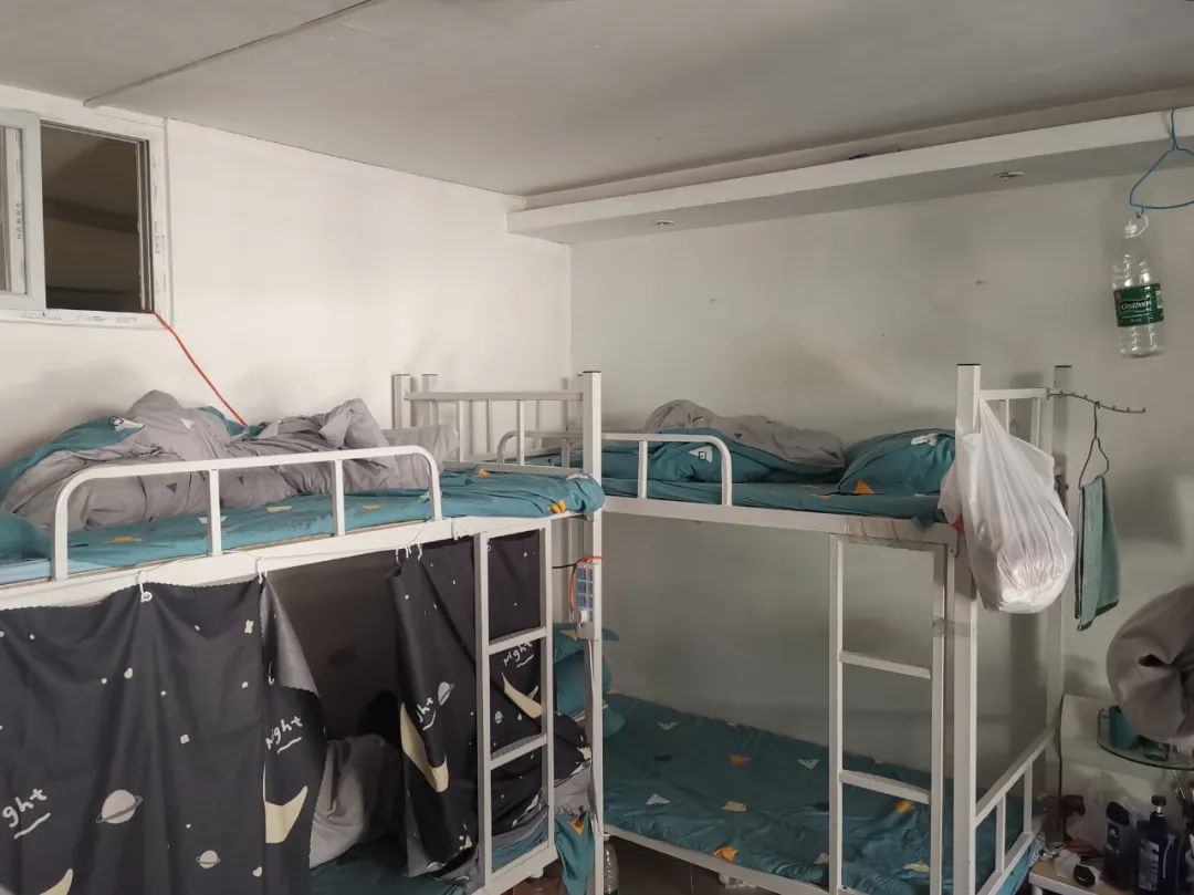 房间内空间狭小,矿泉水只能吊在天花板上;没有保险柜,我只能把贵重物品藏在行李箱里,我有一个1万多的无人机,所以每天出门都提心吊胆;客厅里,没有人聊天,只有人沉默地抽烟。