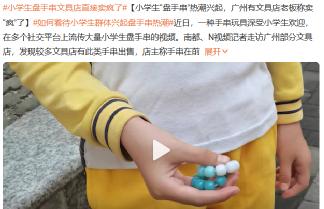 而在萝卜刀之前的上一个“顶流”是“盘串”,小学生们人手一把珠珠,上课在课桌下面盘,课间聚起来一起探讨盘串的经验,一边盘串一边写作业。此前,相关词条数度登上热搜,知名演员陆毅的两个女儿也在Vlog中笑着盘串,手法显得很熟练。