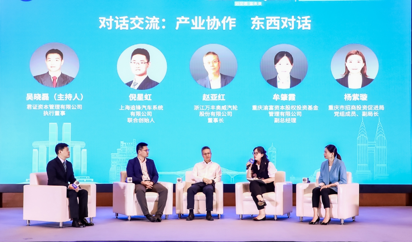 由君证资本执行董事吴晓磊担任主持人,重庆市招商投资促进局党组成员、副局长杨紫璇,渝富资本股权投资基金管理有限公司副总经理牟肇霞,浙江万丰奥威汽轮股份有限公司董事长赵亚红,上海追锋汽车系统有限公司联合创始人倪星虹,分别代表东西部进行了产业协作的对话交流。