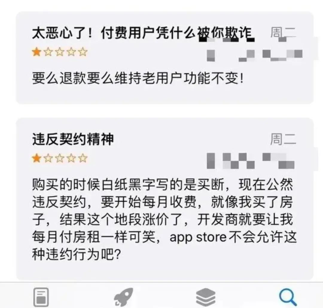 例如Notability这个笔记软件,前期推出买断价格60元,促销活动时价格一度低于25元,却在2021 年Notability宣布由买断制转变为订阅制,转变后,老用户享有一年免费权益,一年之后需要通过付费订阅解锁核心功能,该行为被老用户骂上热搜,遭到热度的反噬。