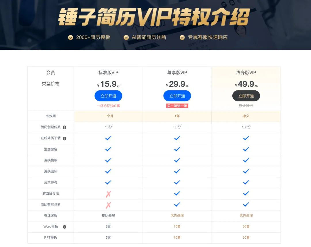 如锤子简历,对于用户而言比较陌生的简历平台,设置了49.9的终身会员选择。简历是普通人总会制作的事物,如果第一次使用吸引到用户,那用户就会选择消费一次终身会员来为自身带来便利。
