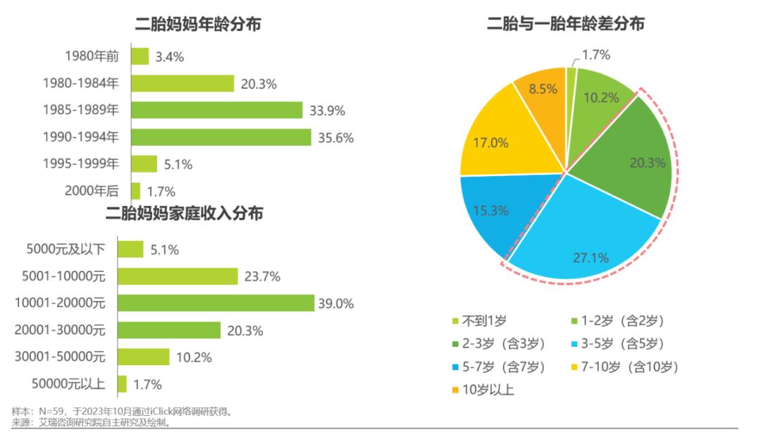 出生年份处于1985-1994的二胎妈妈最多,家庭收入集中于10001-30000元区间,二胎与一胎年龄差多为2-5岁