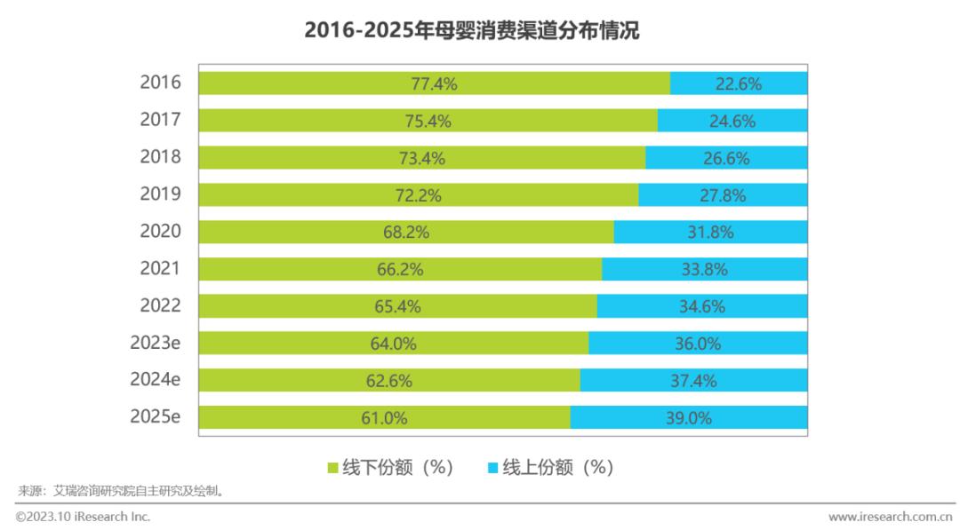 随着区块链、物联网、5G和人工智能等技术的快速发展,实体经济与线上经济的融合逐渐深入,品牌主也更加注重运用互联网流量进行广告营销。2022年中国 母婴市场规模达37552亿元,2016到2022年线上母婴消费占比由22.6%提升至34.6%,上浮12%,有望在今年突破4万亿元。