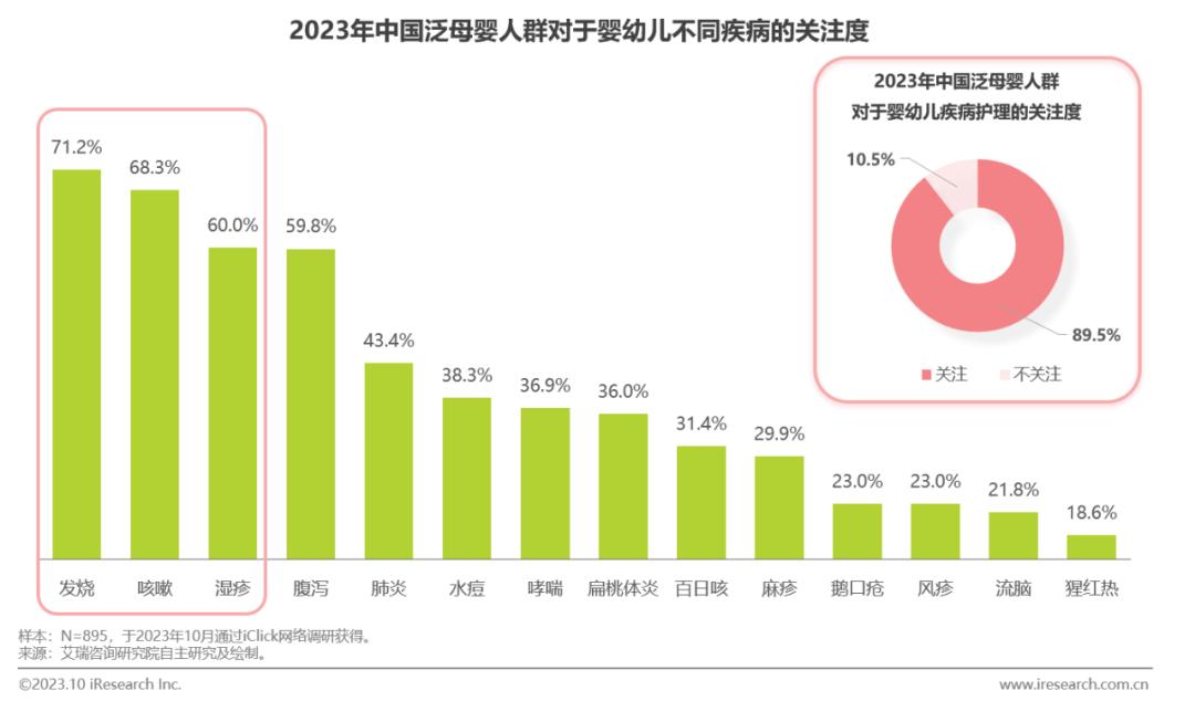 近九成受访用户非常关注婴幼儿疾病护理,其中发烧、咳嗽、湿疹的关注度位列前三