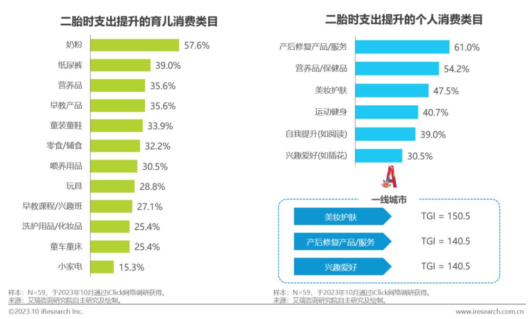 二胎育儿消费支出增加的类目TOP3为奶粉、纸尿裤与营养品;二胎妈妈个人消费较为重视产后修复、营养补充与美妆护肤