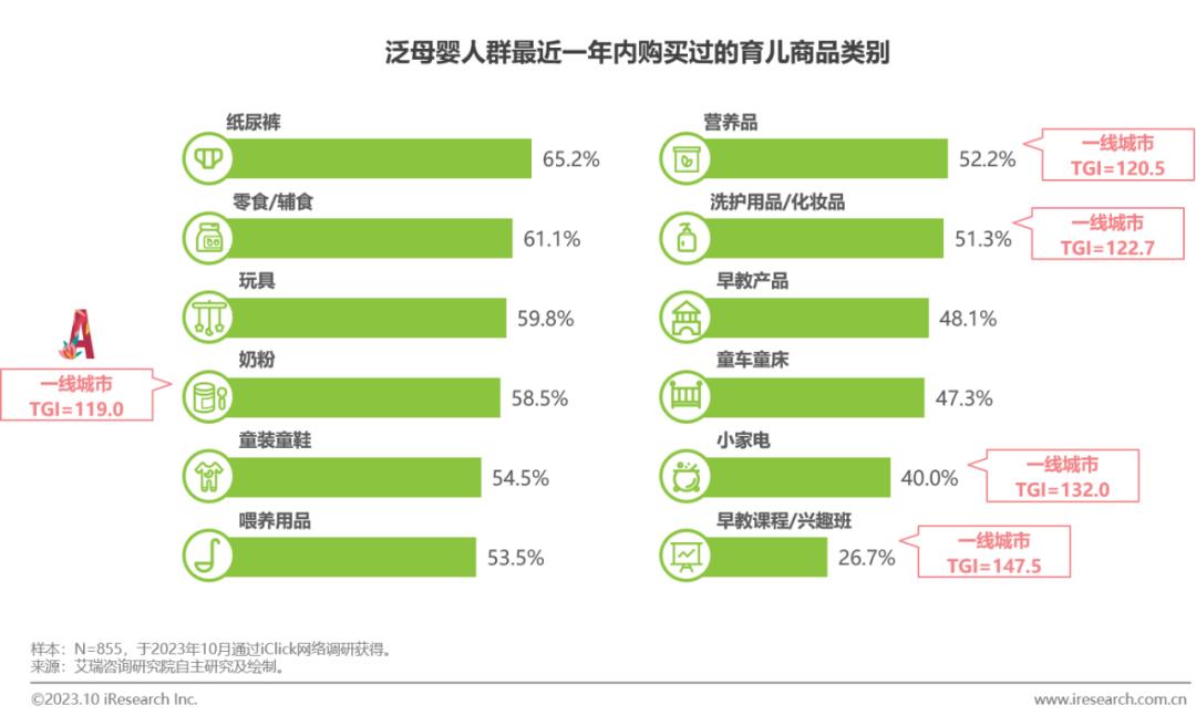 育儿商品消费类别TOP5为纸尿裤、零食/辅食、玩具、奶粉与童装童鞋;一线城市的小家电及早教课程购买力显著