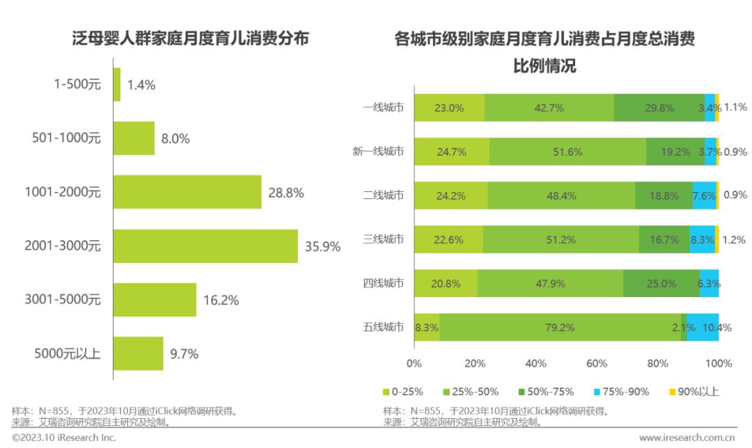 泛母婴人群家庭月度育儿消费集中在2001-3000元,各城市等级月度育儿消费占总消费的比例集中分布在25%-50%
