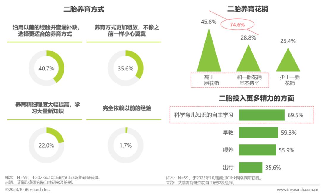 倾向于选择经验与学习结合的养育模式,七成以上受访者的二胎花销不低于一胎水平,投入更多精力学习科学育儿知识