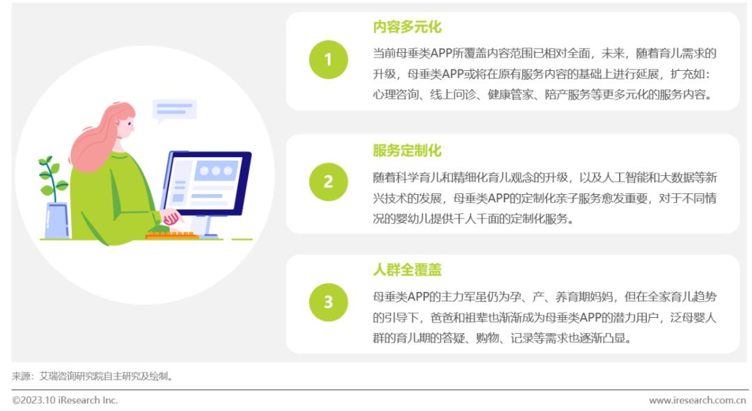 随着精细化育儿、科学育儿、全家育儿等育儿观念的升级,未来,母垂类APP或将向更加多元化、定制化、体系化、全覆盖的方向发展,从多方面吸引和扩大潜在用户,提升现有用户依赖度,在纵向和横向齐发力,通过全面的深度精细化服务缓解家庭育儿焦虑。