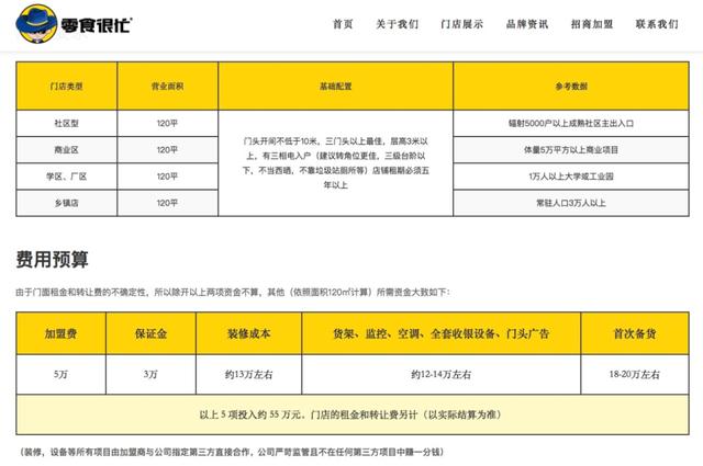 简单算一笔账就可以理解,“趣解商业”通过零食很忙官网的招商加盟内容获悉,加盟商除120平米店面的租金外,初期投入金额(包括装修、门店陈设、备货等)需要55万元,其中规定每家门店都要缴纳5万元加盟费,如从现有的3000家门店推算,零食很忙仅加盟费就有1.5亿元。