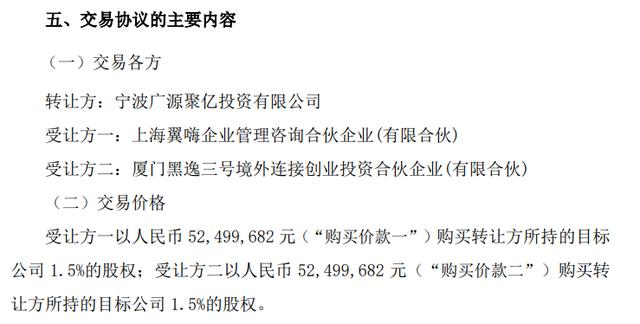 10月17日,良品铺子(603719)公告称,其全资子公司广源聚亿拟将所持宜春赵一鸣食品科技有限公司(以下简称“赵一鸣零食”)3%的股权,以总计约1.05亿元的价格,转让给上海翼嗨企业管理咨询合伙企业(有限合伙)、厦门黑逸三号境外连接创业投资合伙企业(有限合伙),交易完成后广源聚亿不再持有赵一鸣零食的股权。