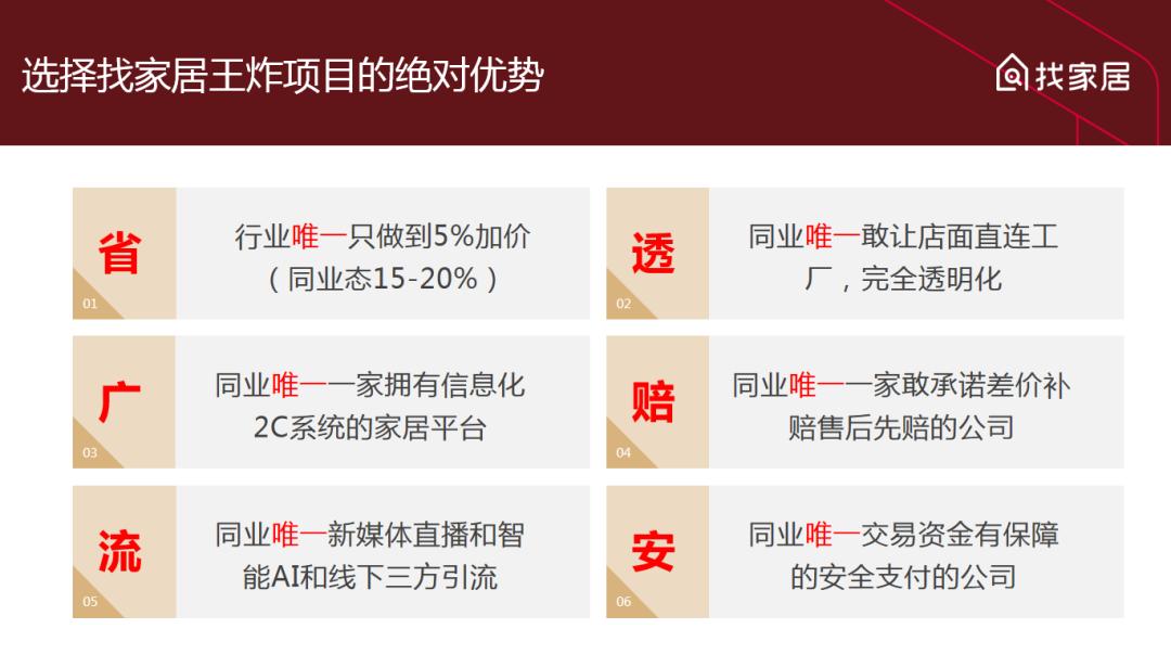“找家居”将在全国范围内投资200个仓储店,每个仓储店预计投入100~200万元,年利润能达到300万到600万,即3~6个月可回本。每个仓储店从店面选址到设计,从选品到摆场,整个过程皆由“找家居”专业人员对接,全程参与,并跟踪后续培训,指导开业和日常经营,帮助合作伙伴快速开店实现盈利。