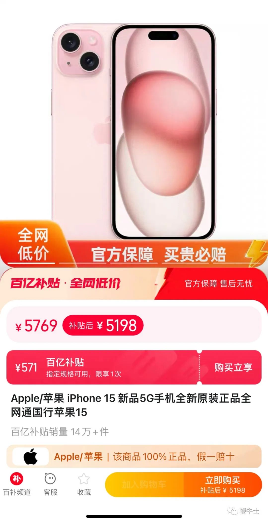 在拼多多平台,百亿补贴过后,iPhone 15基础款128g最低价格5198元,比官方的5999元下跌700元,256g最低价6098元,比官方的6999元下跌达900元;iPhone 15 Plus 128g券后价6148元,比官方的6999元下跌850元。