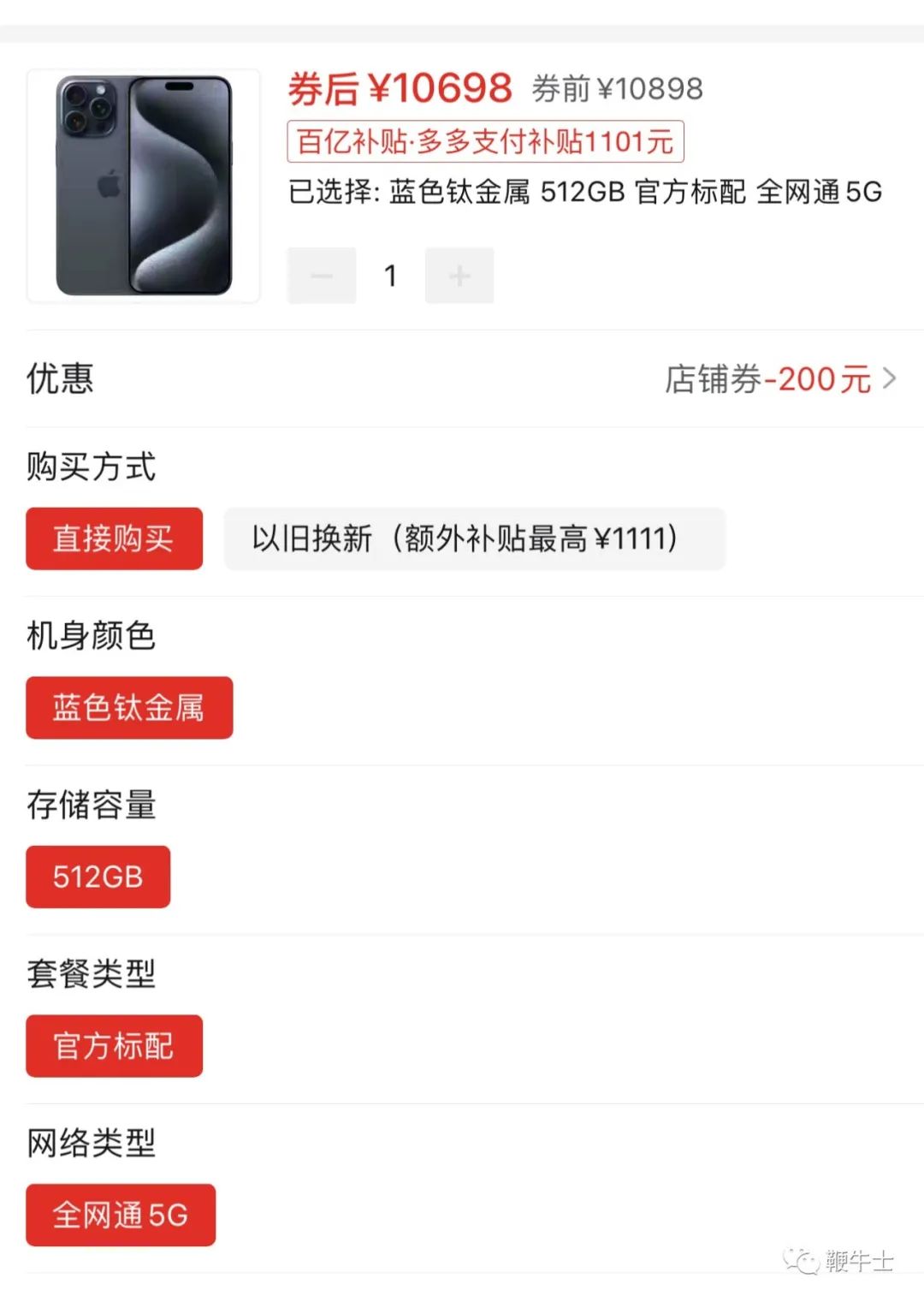 在拼多多,iPhone 15 Pro 128g最低售价7698元,比官方的7999元下跌300元,256g最低售价8298元,相比官方的8999元下跌700元;iPhone 15 Pro Max 256g最低售价9098元,相比官方的9999元下跌900元,而512g最低售价10698元,相比官方的11999元下跌高达1300元。