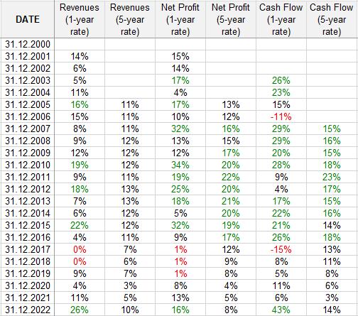如果我们分析过往二十多年诺和诺德的营收、净利润和现金流增长(为了消除单独某个年份的异常值,下表选择了 1 年增长率和 5 年增长率),可以看到如下结果: