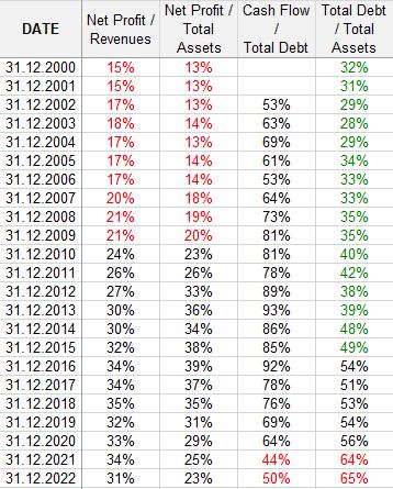 唯一不足是其债务比率正在缓慢上升。2010 年总债务与总资产比率为 40%,但到 2022 年缓慢攀升至 65%。2010 年及之前,这个数字稳定在 35% 左右;另一方面,同期净利润率约为目前的一半。可以得出结论,在过去 22 年里,诺和诺德负债率增加了一倍,同时利润率也增加了大约一倍,所以这样的扩张是积极有效的。