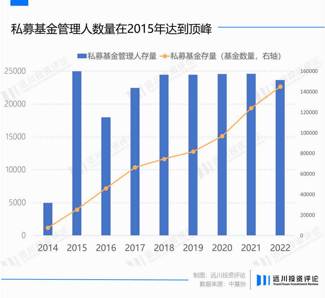 2014年至2015年间,私募行业快速扩容,存量管理人数量在2015年达到顶峰
