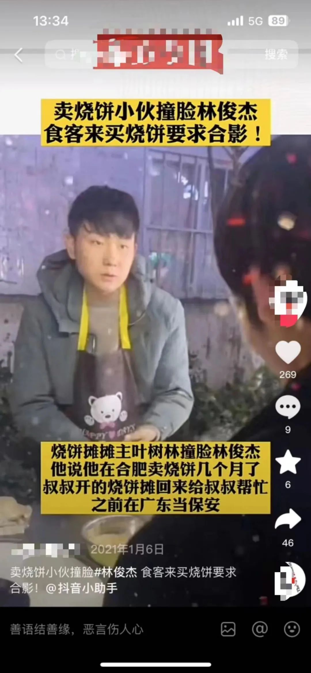 2020年底,安徽合肥,叶树林卖烧饼的视频被网友上传网络后,因酷似林俊杰冲上热搜,他也在短时间内涨粉近10万,迈入普通人和假明星的反复切换之中。