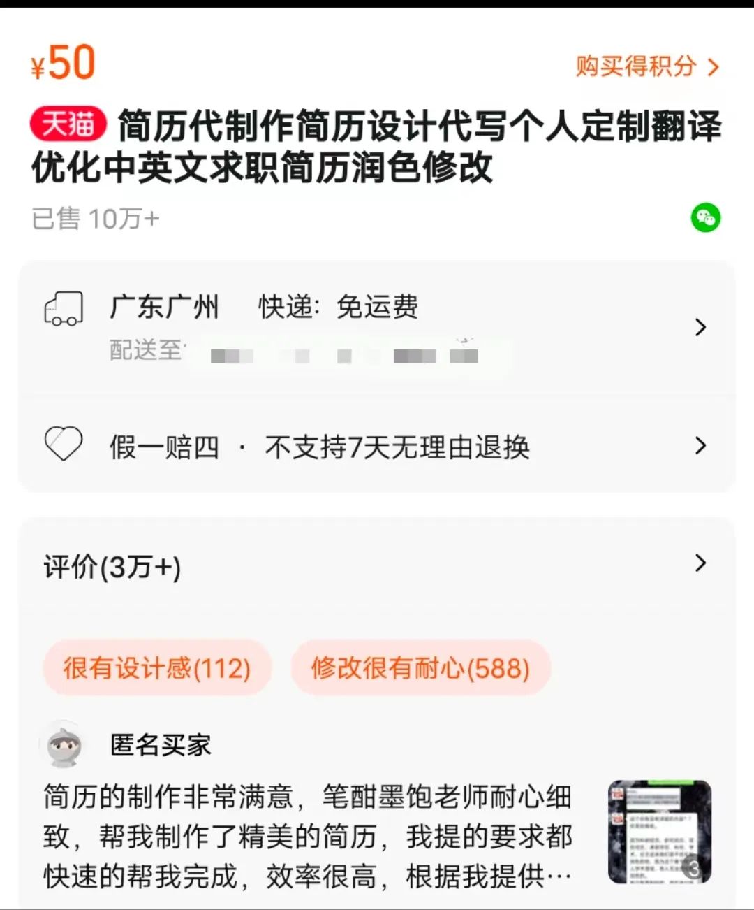 淘宝是简历优化业务最早的主阵地,竞争比较严重,头部效应明显。某个店铺50块的简历优化服务,销量已经冲到了10万+单了,评论也高达3万+条。