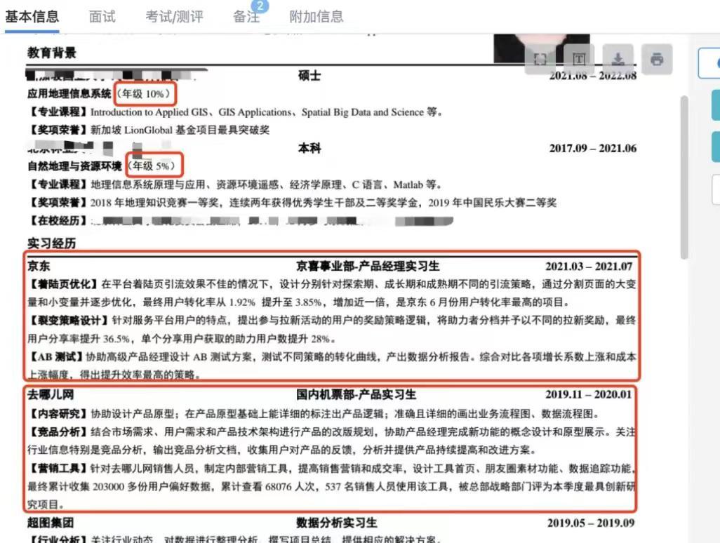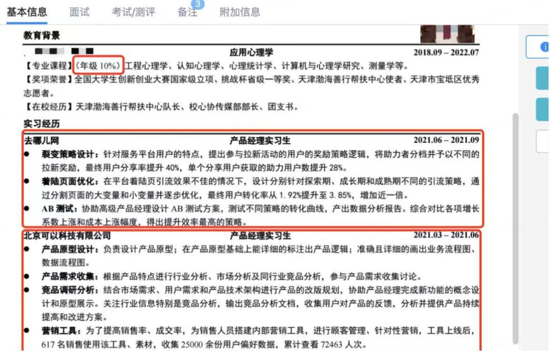 看看下面两个候选人,产品经理的实习经历只是调整了一下要点的顺序,其他的内容一模一样。