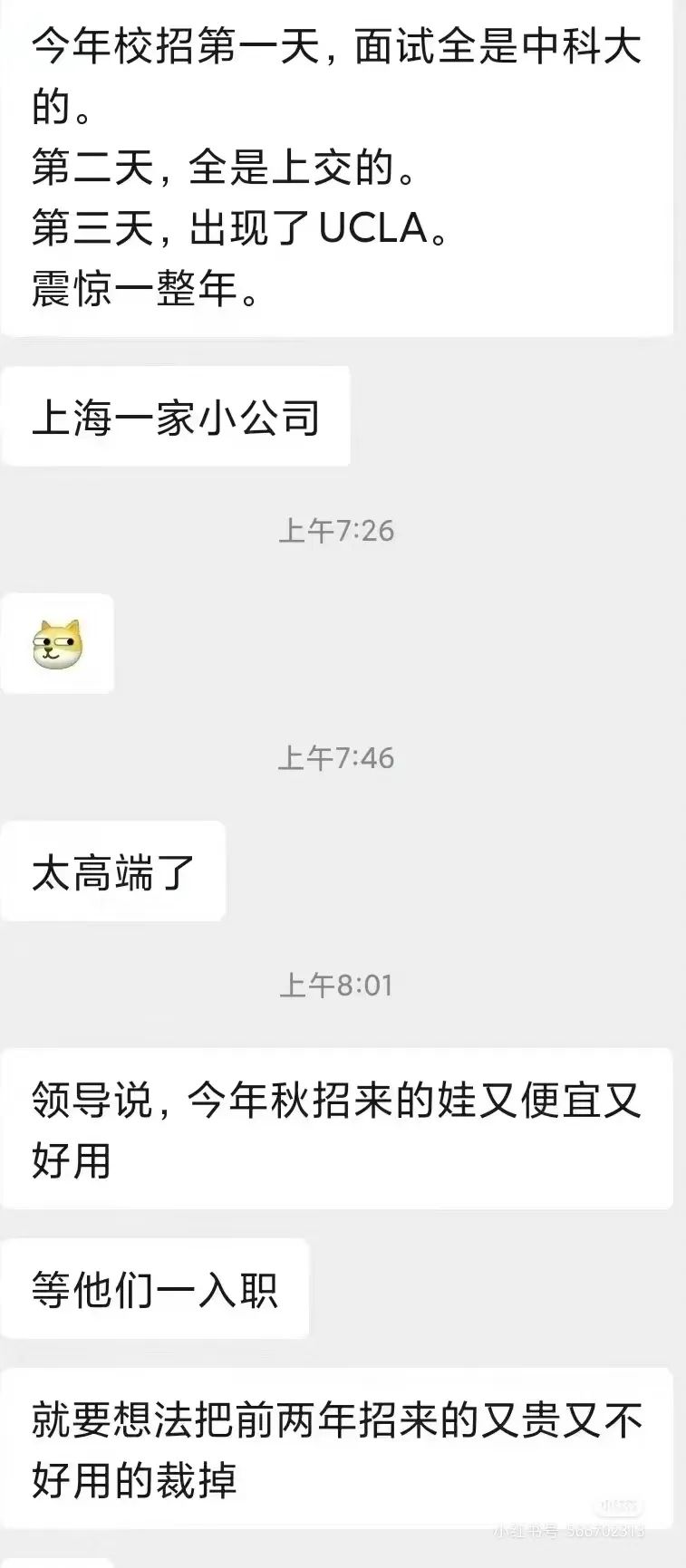 求职者的伤害何止这一点。最近,“今年秋招的娃又便宜又好用”成为热点。上海一家小公司的面试者群英荟萃,学历之高,令人瞠目。