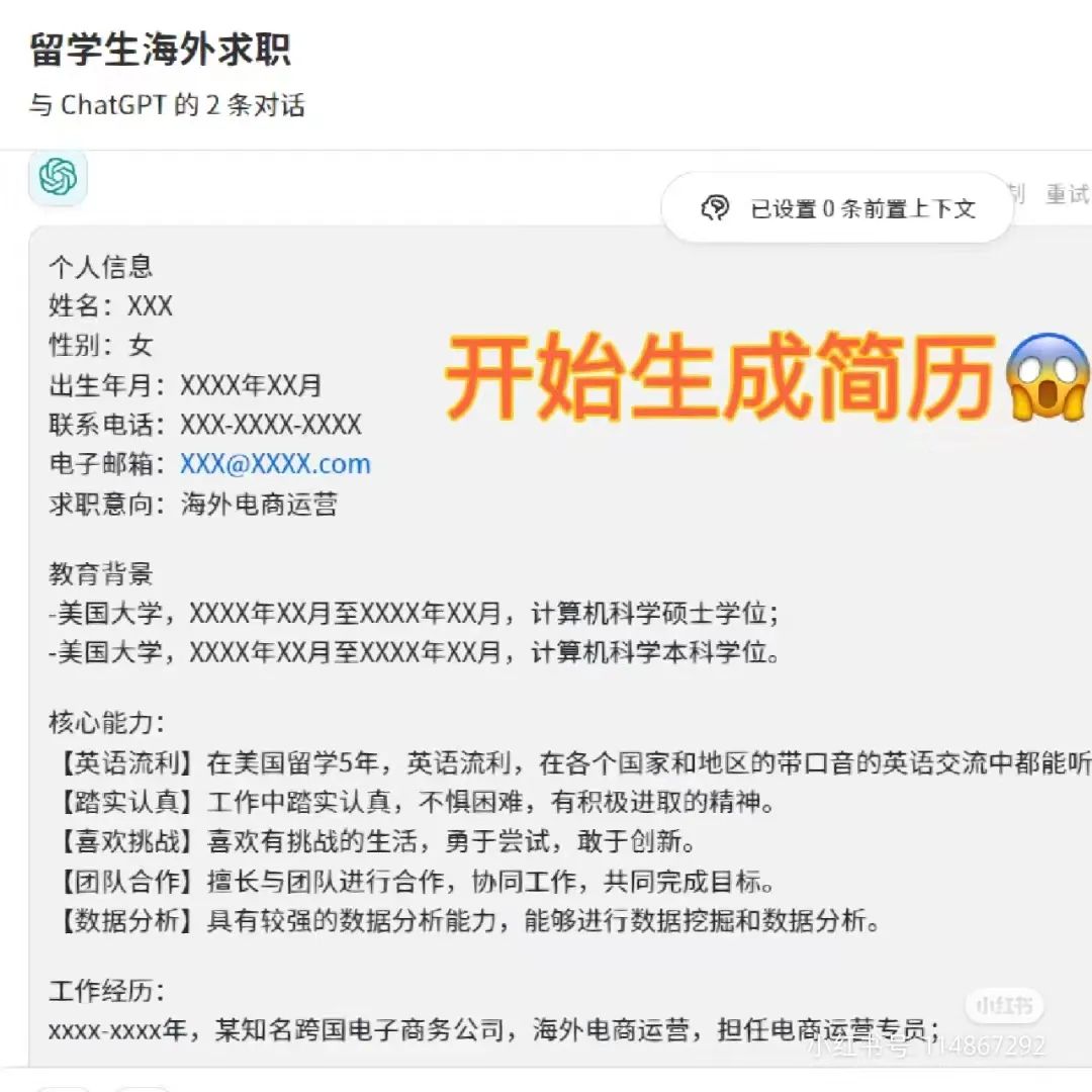 以最流行的AI大模型chatGPT为例,只要输入让它生成简历的提示词,再用一句话概括自己简历的要求和内容,它就能完整地输出一整篇简历,再通过导入文本反复修改,最终的成品只能说,比大部分人靠自己脑子想出来的要强得多。