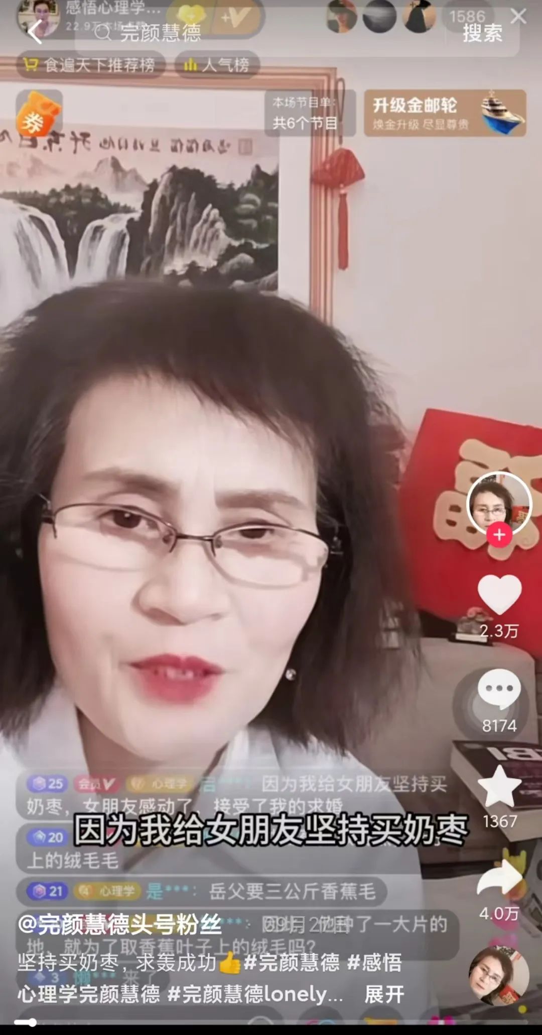 彼时的完颜慧德在视频中的表现,也略显生疏。造型虽然不至于时尚,但发型干净利落、衣着整洁,有些视频中甚至还能看出是精心打扮过的状态。当然,早期的完颜慧德所吸引的,也主要是一些中老年人。