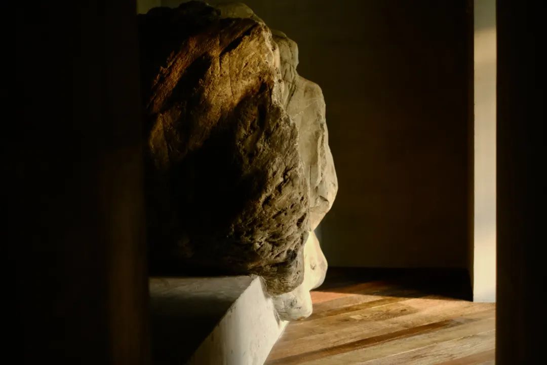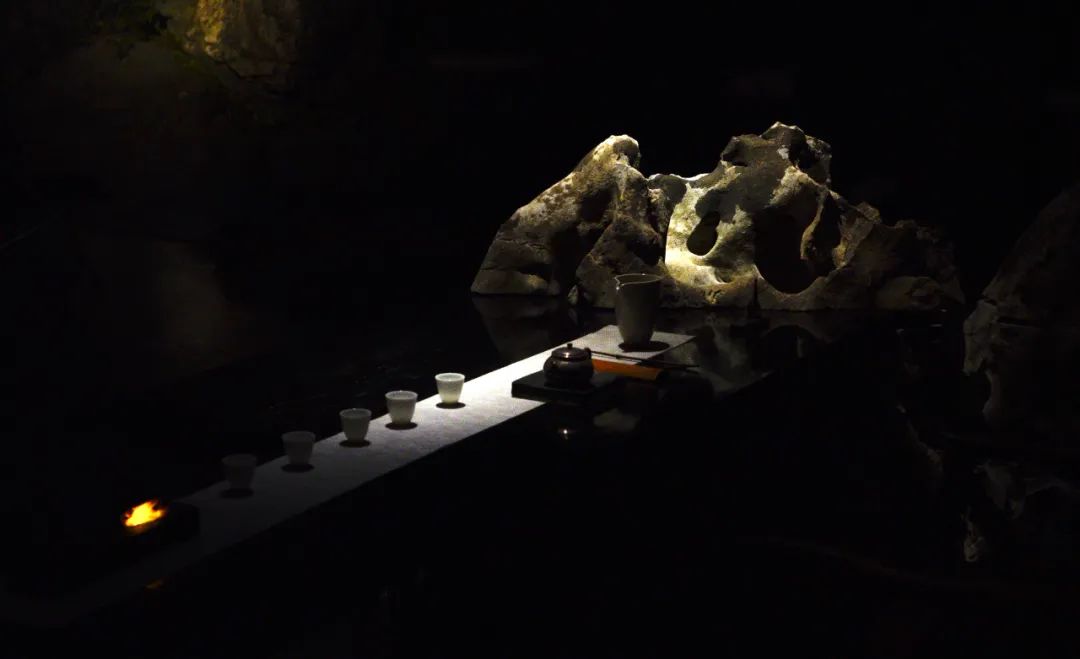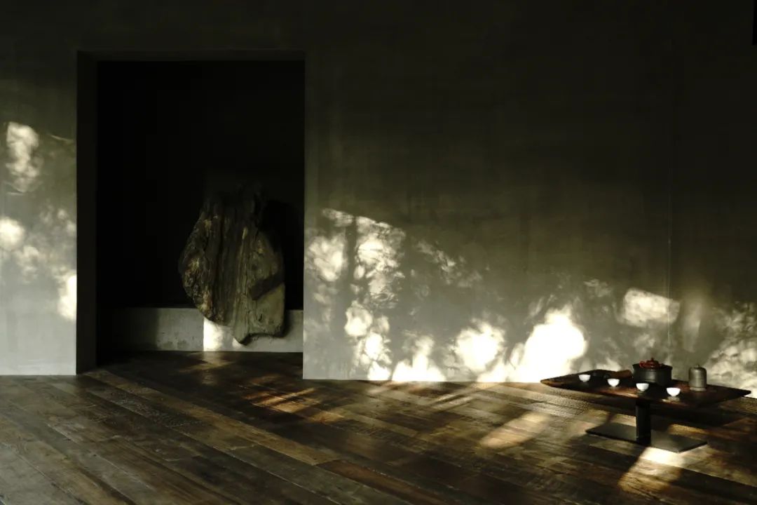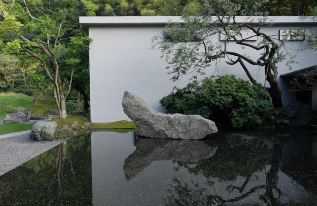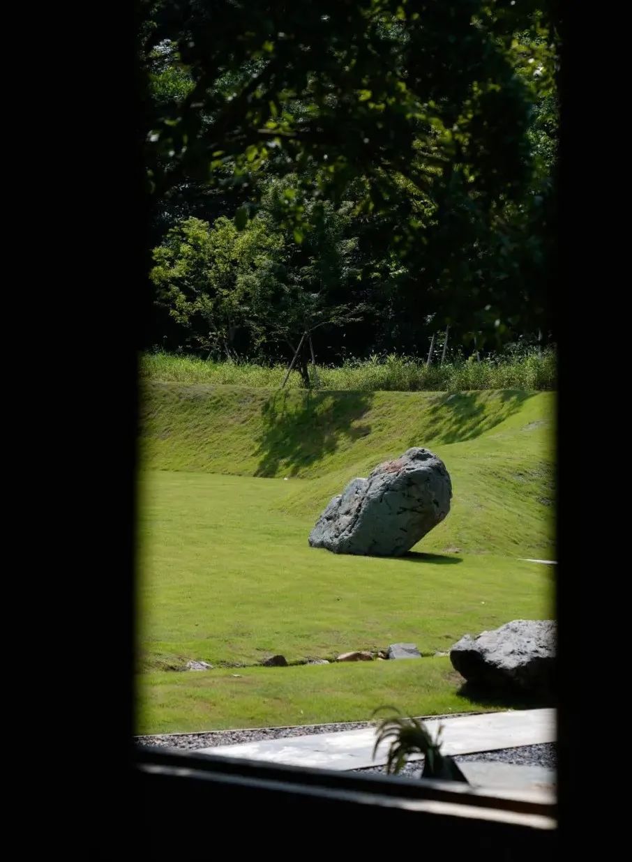 比如茶室入口的石头,它的正面有一个流水侵蚀的意向,我们把它立在西面,刚好正对长窗,跟窗外山林、瀑布遥相对话;它的侧面其实是一个佛首的脸,带有一丝禅意,特别地写意和抽象。