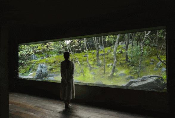 视觉上它是一个向外的空间,人一进来就会被扑面而来的山水、翠绿的苔藓、层层的山林所吸引。阳光穿过树林,在地面和墙面投射出光影,特别能安静地感受到时间的流动,甚至是光和风的形状。