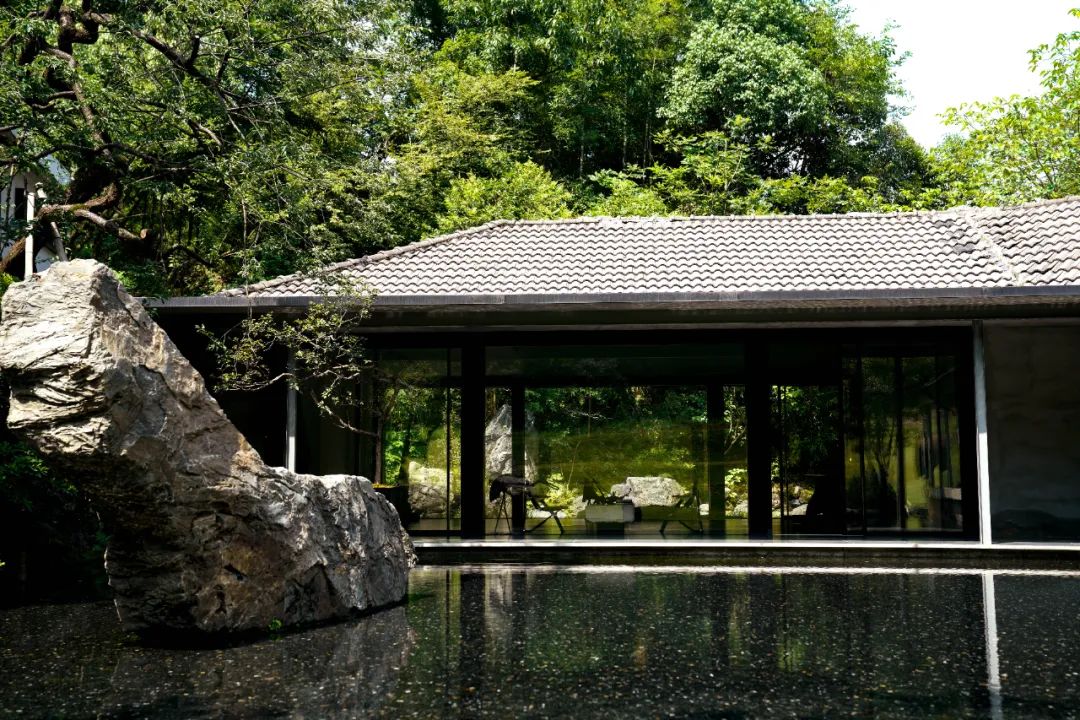 我们想把自然拉得更近一点,甚至把石头也搬到室内来,在玻璃交界处,我们开一道槽,小心翼翼地把它给插进去,一部分跨入室内,一部分悬挑在鱼池、小溪上面。可以随时拉开移窗,走出去,走到水系中,走到山林里。