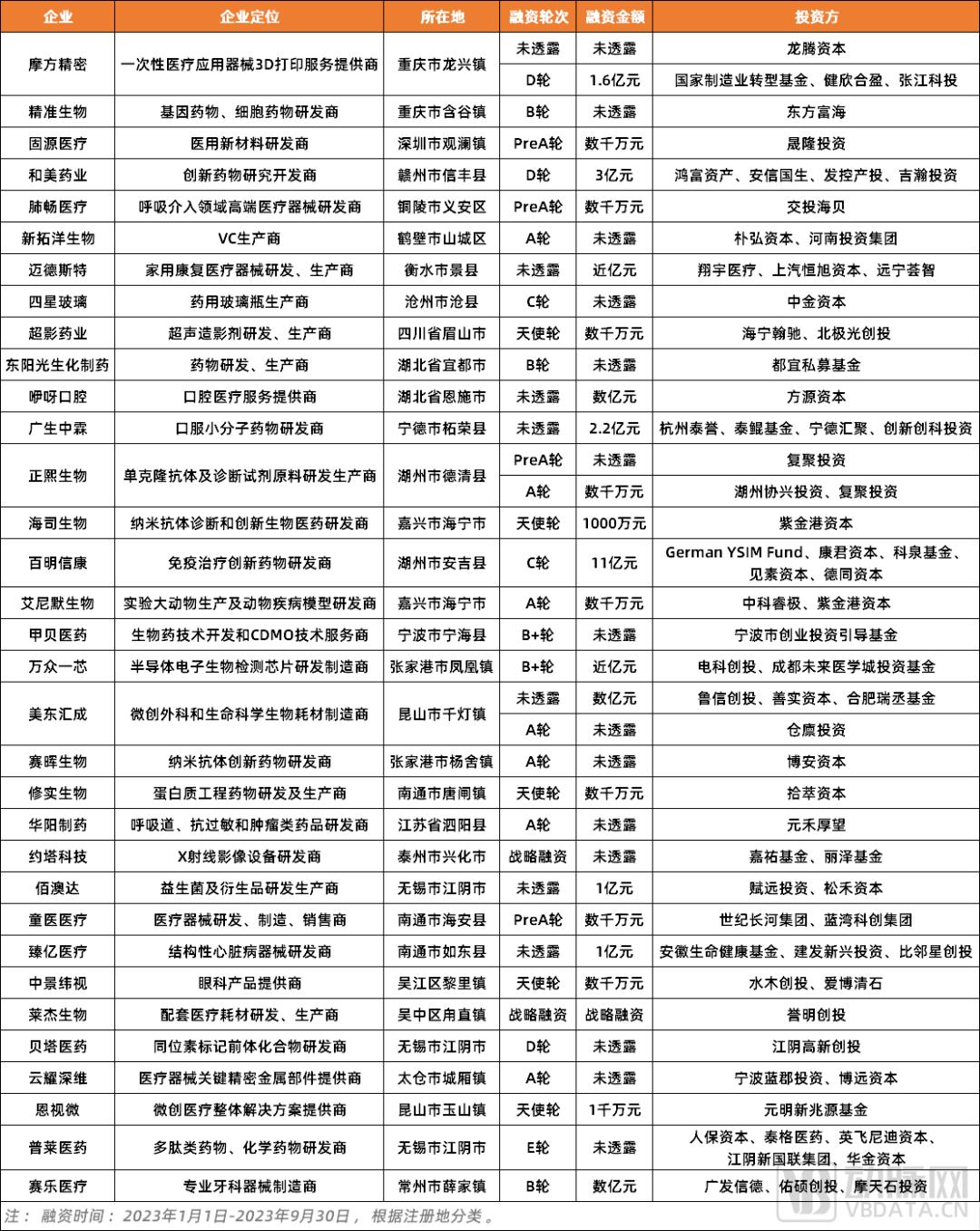 图2. 2023年1月-9月区县级医药企业融资情况(数据来源:动脉橙)
