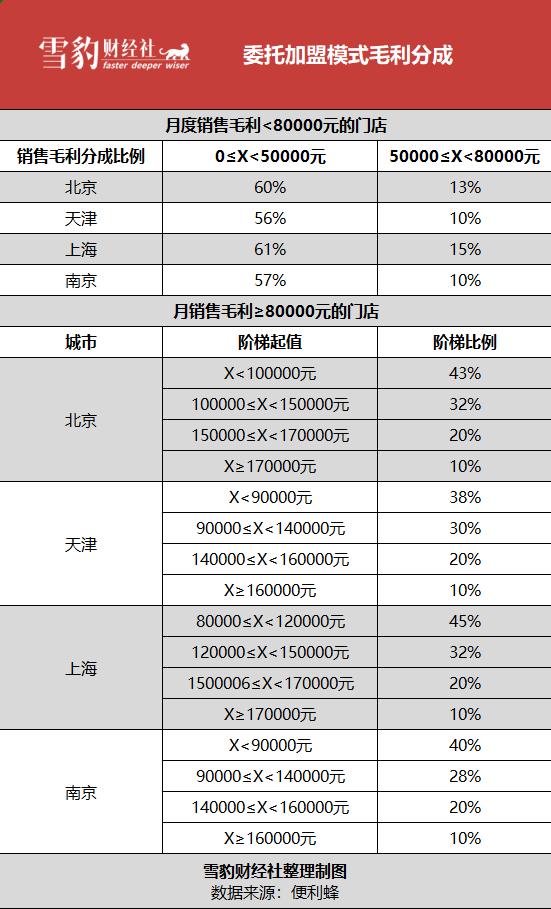按图中的分成比例来算,以北京为例,月度销售毛利为16万的门店,加盟商到手收入为100000*43%+50000*32%+10000*20%=61000(元)。