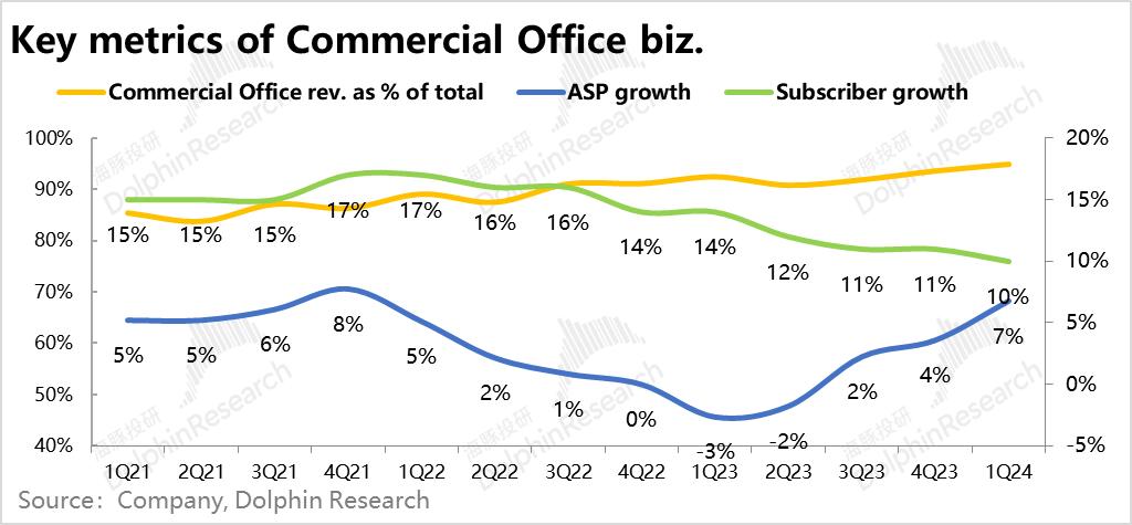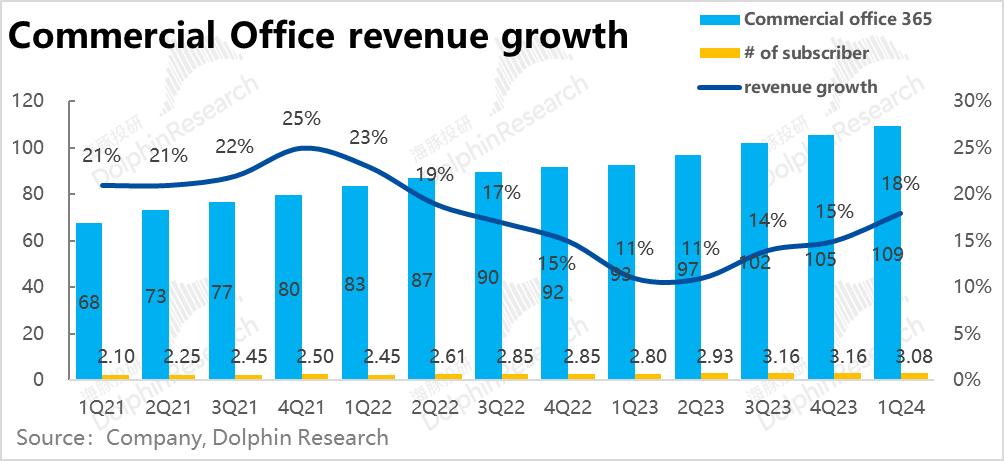 2)价的角度,本季度Office 365客单价同比上升了7%。虽然去年同期是基数最低点也有影响,但据我们测算客单价上升了超2美元,海豚君认为先前Office Copilot发布后,远超市场预期的定价驱动了Office平均客单价的明显提升,AI浪潮在Office业务上也开始有明显的业绩贡献。