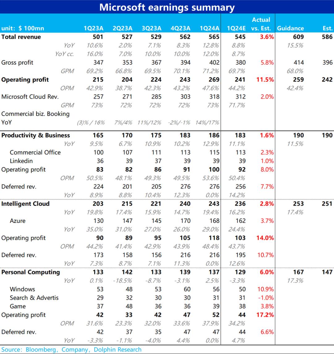 1. 营收增长复苏,利润释放更是强劲:先看总体业绩,微软本季实现营收565亿美元,明显超出市场预期的545亿。同比增速也由上季度的8.3%,大幅提升到了12.8%,增长复苏拐点正式确立。同时在AI功能逐步推出拉动产品毛利,而公司降本成效也在继续释放的共同利好下,微软本季度经营利润高达269亿,远超市场预期的241亿。经营利润率环比提升了4.4pct。靠着并不算高的营收增速,却能长期实现更高利润增长的微软正式回归了。