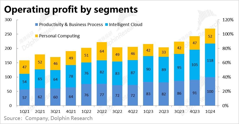 3)最终微软本季的经营利润达到了269亿美元,同比增幅达到25%,也远超市场预期的约241亿经营利润。公司经营利润的增速再度远远领先营收增长,微软重回靠规模效应和产品提价,靠着不算高的营收增长,长期稳定实现更强利润增长的轨道内。