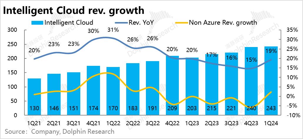 由于核心的Azure和其他业务增长都触底反弹,本季度智慧云板块整体实现营收243亿美元,同比增速由15%明显提速到19%,高于公司指引和市场预期的236亿。