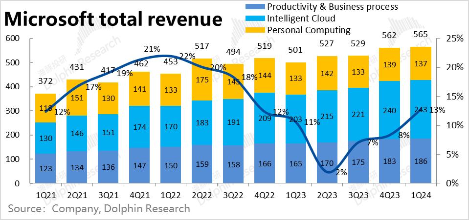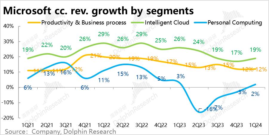 整体来看,微软本季实现营收565亿美元,明显高于市场预期的545亿,三大板块都小超预期,主要是个人计算业务的贡献,同比增速也由上季度的8%提升到13%。