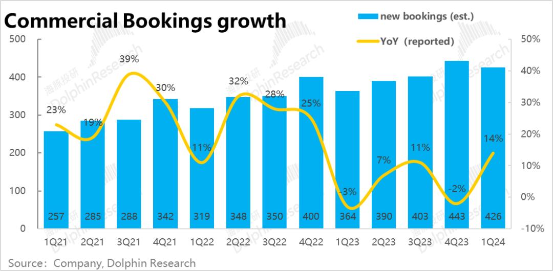 而反映当季增量的新签企业业务合同金额,却有不俗的增长,同比上升了14%,虽然有去年同期是基数大底的利好,但仍能看出本季度企业新增的云计算和其他IT支出有所回升。