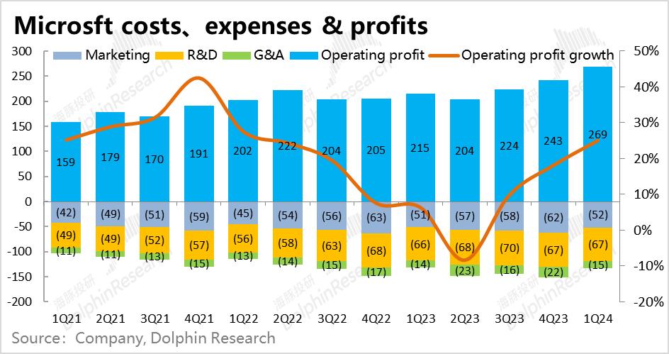 毛利上,因为营收结构中高毛利业务占比提升,和AI功能推出后云计算和生产力相关产品的提价,微软的毛利率提升到71.2%,同环比来看提升了整整1-2pct。