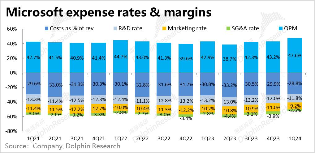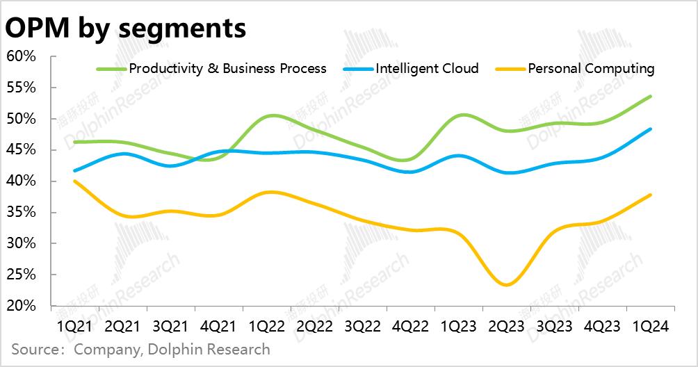 1)本季度实现毛利402亿美元,毛利率明显提升到71.2%,同比环比来看都有不小的改善。据公司的解释,近两个季度毛利率持续提升主要是因为公司营收结构中高毛利业务占比提升,以及AI功能推出后,云计算和生产力板块主要产品提价。