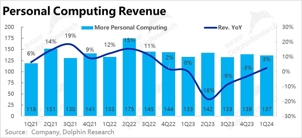 除了核心业务的回暖,先前表现最差的个人PC业务同样有超预期的回暖。本季个人计算板块实现营收137亿美元,增速终于止跌转正到3%。从预期差的角度,实际收入高出市场预期8亿美元,是公司三大板块中营收超预期最多的板块。