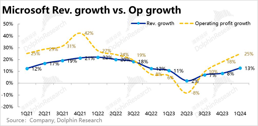 5、对外产品提价、对内压低成本,经营杠杆大幅提升:营收层面,微软的增长有不错的回暖,但相比微软本季的利润改善更加显著。