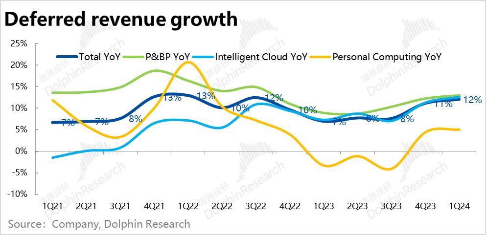 细分来看的话,各板块的递延收入增速也有环比有所提升,但其中当季营收修复最好的个人计算业务递延收入改善却较慢。