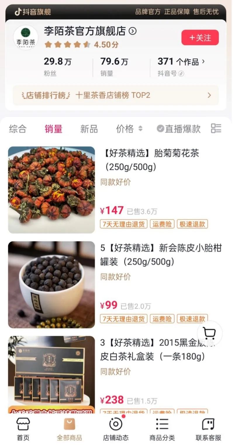 从时间线来看,2022年3月,抖音电商主动开放茶叶类目招商,进一步缩短开店流程,或许是李陌茶品牌入驻抖音的契机。而从类目来看,李陌茶所属的食品饮料行业,也是在抖音电商平台上较容易出现黑马的赛道。