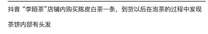 值得注意的是,像李陌茶这般新品牌的出现,也为抖音电商的供应链能力带来新的挑战。新浪旗下消费者服务平台黑猫投诉显示,有消费者就曾因“发现茶饼内部有头发”、“喝出疑似鸭毛异物”、“伪造食品生产日期”等缘由投诉抖音,这无疑给平台口碑带来一定负面影响。