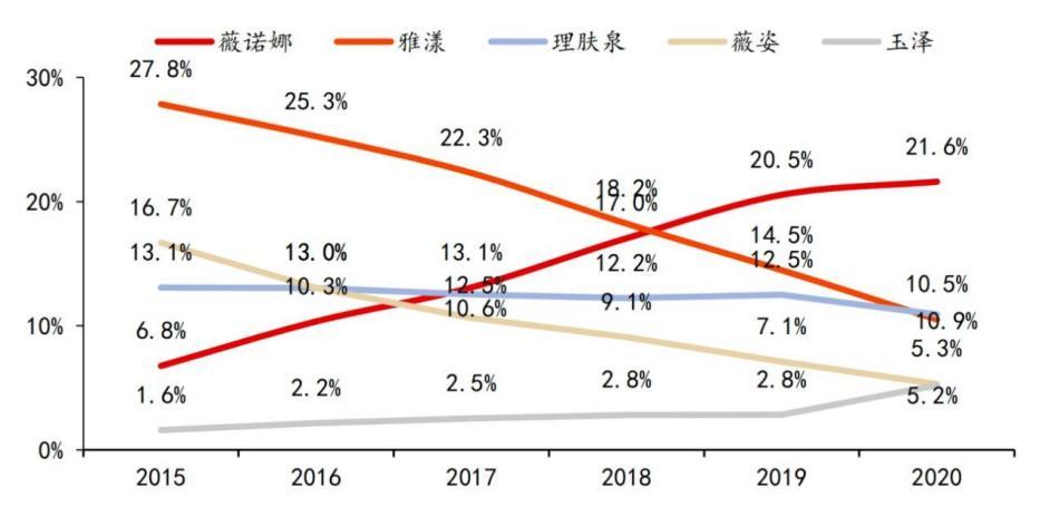 但在此后的几年时间里,雅漾、薇姿、理肤泉的市占率均有不同程度的下滑。到2019年,雅漾、薇姿、理肤泉分别下滑至14.5%、7.1%、12.5%,被国货品牌薇诺娜以20.5%的市占率赶超。