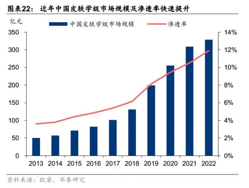 据欧睿国际数据,2019年中国的皮肤科学化妆品市场规模占整体化妆品护肤市场的13.6%。他们预测到2024年,该市场规模将达到整体护肤品市场的22.9%,年复合增长率(CAGR)为24.9%。