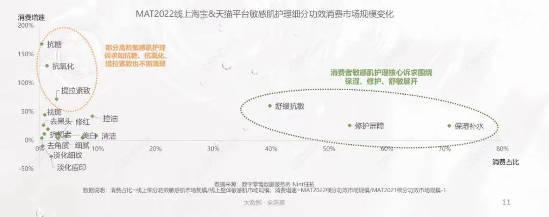 相较于非敏感肌人群,修护肌肤屏障并满足保湿、补水、清洁等基础需求是敏肌人群的首要诉求。而当这些底层需求得到满足后,更多进阶的功效需求也就来了。